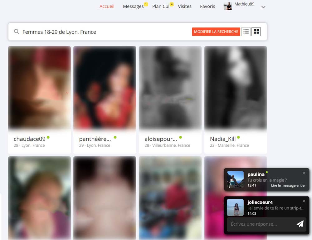 Dès nos premières minutes sur le site, on se rend compte que tout est fait pour que la recherche de plan cul soit simple et rapide. Les photos de profil ne sont pas aussi suggestives que ce qu’on a eu vu, néanmoins les pseudos sans équivoques sont bien au rendez-vous ! Chaudasse69 et CrazyGirl sont de la partie, et ce n’est bien évidement pas pour nous déplaire ! D’autant que ces demoiselles n’hésitent pas à prendre les devants. Nous n’avions pas encore rempli notre profil que nous recevions des invitations à des strip-teases, des sessions webcam hot et autres plaisirs en ligne. Un rapide tour d’horizon des membres inscrits confirme cette ambiance définitivement très orientée vers le sexe : si les photos de profils restent sages, les albums, eux, ne laissent pas vraiment de place au mystère !
